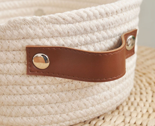 Handvävd förvaringskorg i bomull med läderhandtag